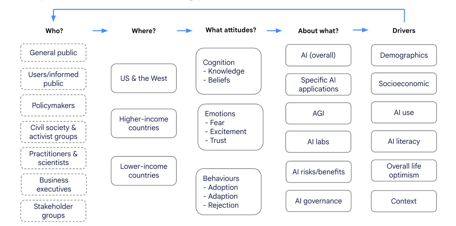 5. What drivers are you interested in?: Many surveys capture less about AI and more about the underlying drivers that motivate people. Demographics, socioeconomic status, and an individual’s broader values and optimism influence not just how much they know about AI, but whether they view it as a threat, a tool, or a distant abstraction.